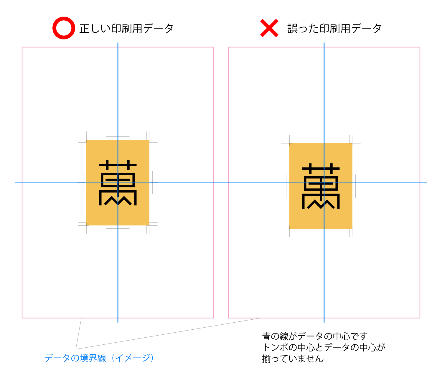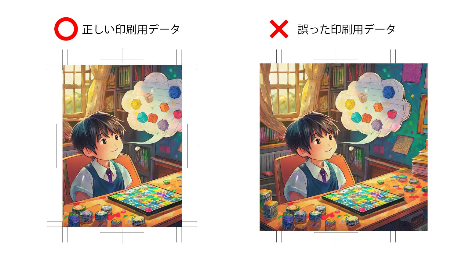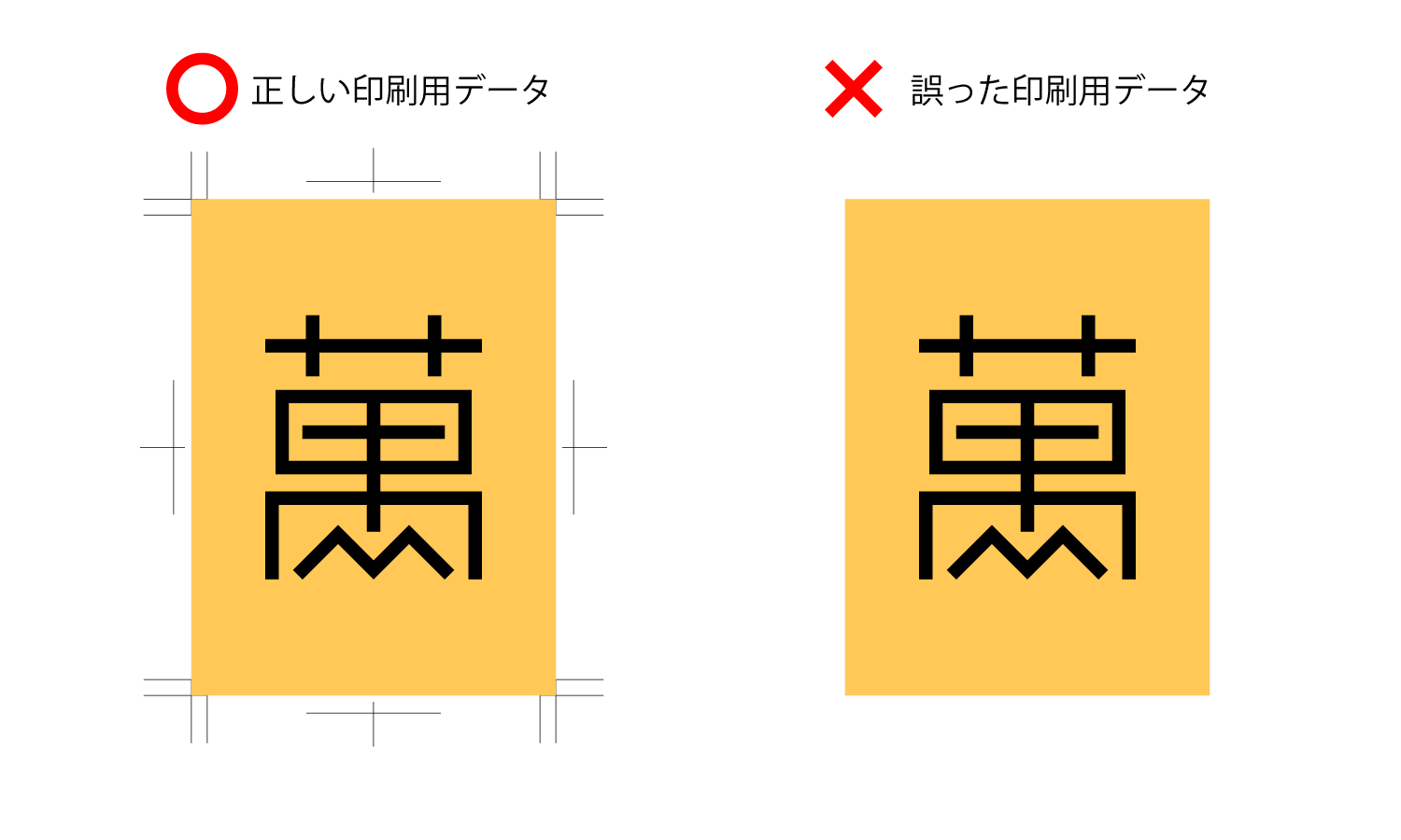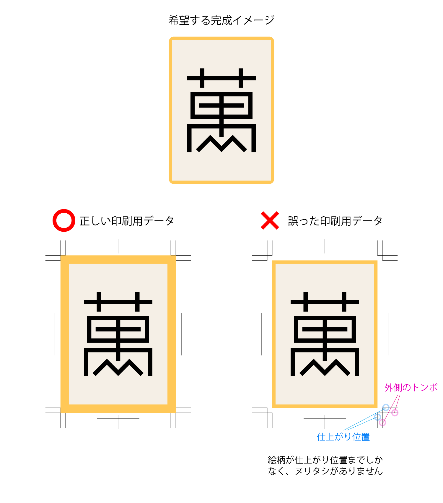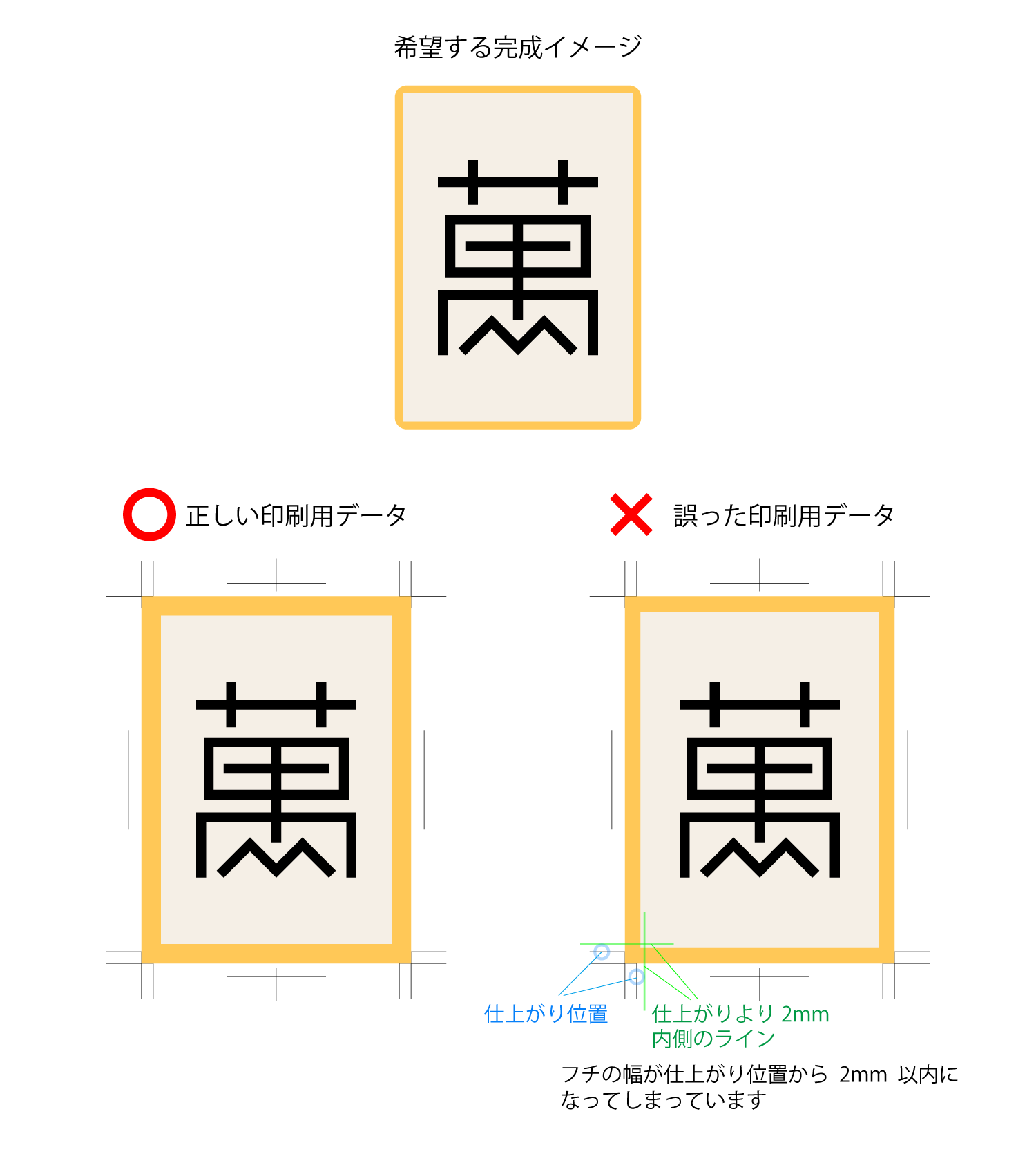 印刷業界では非常に一般的な表現なのですが、これが一般の方には誤解されやすく、「外側の線が仕上がり位置だ」と誤解してデータ制作されていると思われる例が非常に多くあります。