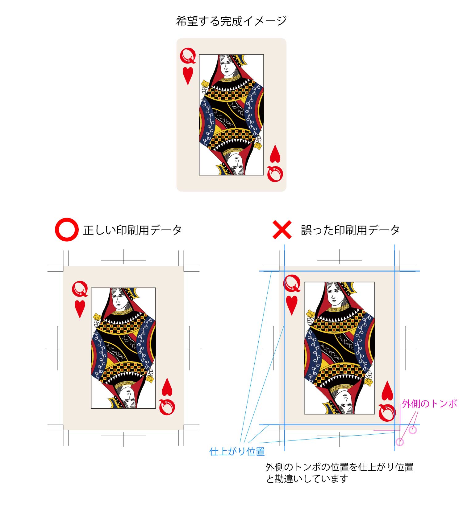 「06.トンボがない」でご説明した通り、トンボはお客様がデータ制作する際の目安であるだけでなく、製品を仕上がりサイズに加工する(切る)際の目安でもあります。