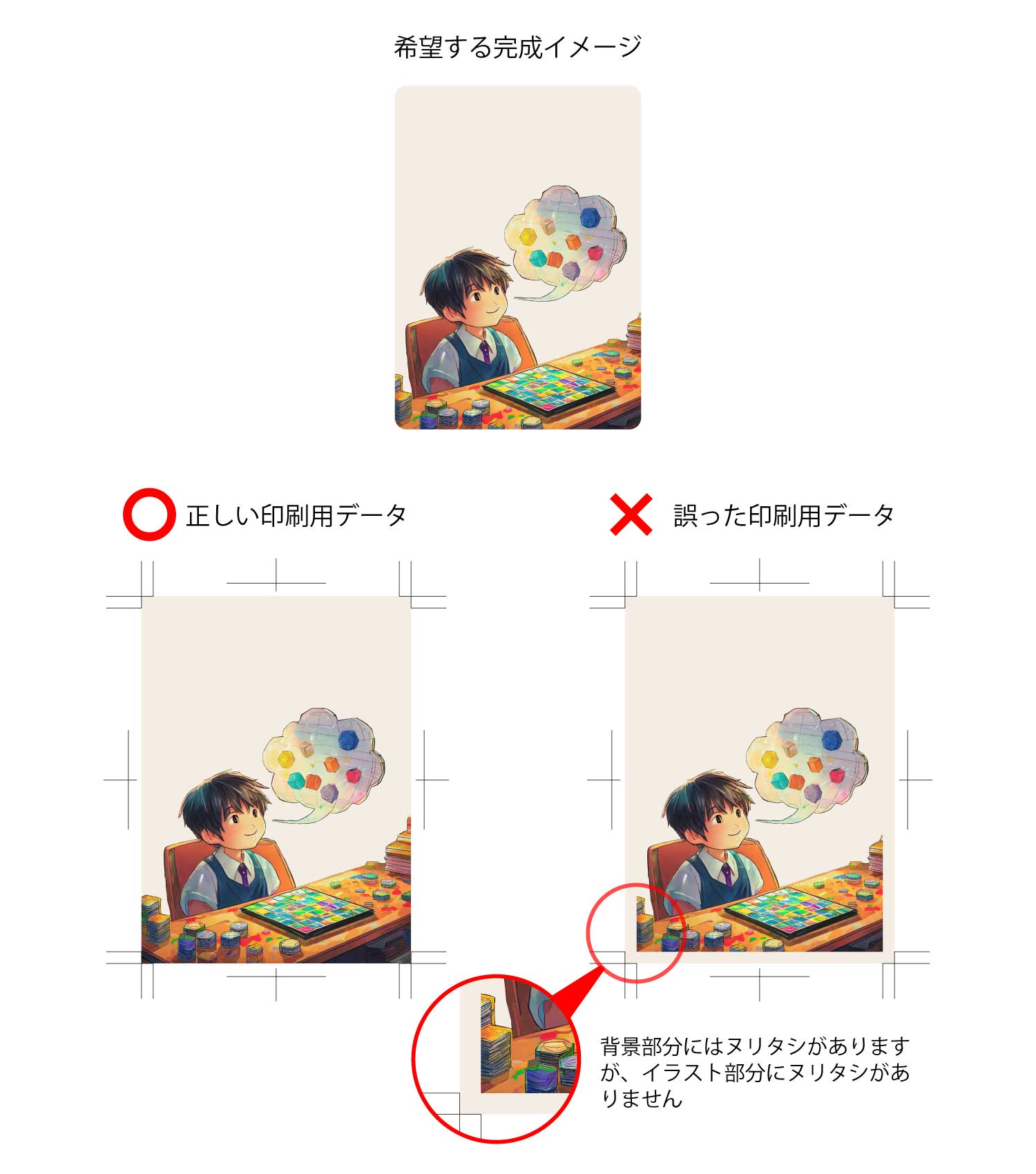 その際に、上記「誤った印刷用データ」の場合だと、少しでも加工がズレれば右の例のように印刷していない白い部分が入ってしまいます。